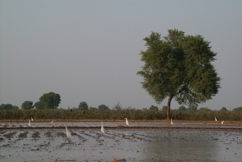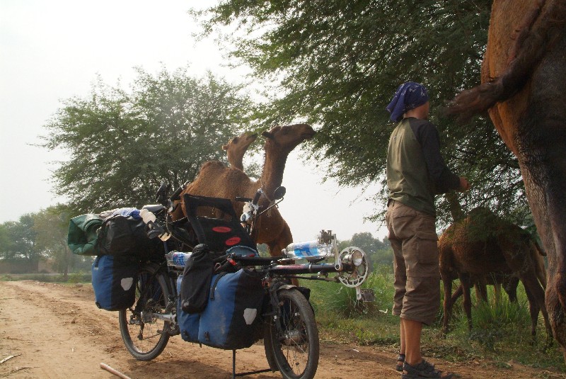 Lahore ist am nächsten Tag nicht mehr weit, aber da uns die starke Luftverschmutzung auf die Nerven geht und wir in Lahore keine Besserung erwarten, fahren wir von der Hauptstrasse ab und durch kleine Dörfer zum "Wildnispark" Changa Manga. Der Weg dorthin führt uns über viele kleine verschlafene Dörfer, Bambushaine und Rosenfelder! Als wir am Nachmittag ankommen, sind wir von dem Park ein bisschen enttäuscht, da er ausser den Rasenflächen und Klettergerüsten scheinbar nichts zu bieten hat. Nach einer Nacht im nahen Hotelkomplex, wo wir ausser den Geckos die einzigen Gäste sind, fahren wir zunächst doch noch mal Richtung Park, um dort einen entspannten Vormittag zu verbringen, Aber wir ergreifen dann blitzschnell die Flucht, als uns in fünf Minuten mindestens zehn Busse mit johlenden, kreischenden Schulkindern überholen- alle Schulen Pakistans scheinen einen Ausflug in diesen Park zu machen! Als Entschädigung treffen wir in einem der kleinen Dörfer noch einen netten Einheimischen, der uns Fäden von seidenspinnenden Raupen zeigt und für uns eine Stange leckeres Zuckerrohr frisch vom Feld holt- sehr lecker! Wir fahren gerade weiter, doch wieder springt uns etwas ins Auge: Auf einem Feld frisst sich gerade eine Kamelherde von Baum zu Baum! Wir fahren sofort hin, und der Hirte ist so freundlich uns alle Tiere geduldig zu zeigen.
