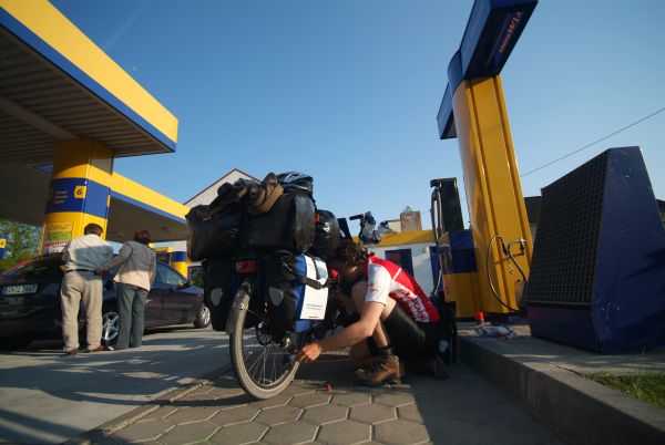 Eine unserer morgendlichen Lieblingsbeschäftigungen ist das Beladens unseres "Packhasens". Das Frühstück ist dann schon meistens halb verdaut und wir sind schon fix und fertig vom Taschen schleppen und Gurte festzurren. Doch nachdem wir recht früh aufgestanden waren, konnten wir uns doch halbwegs zeitig auf das Rad schwingen und uns zu unserer ersten Zwischenstation in Bürstadt aufmachen. Dort waren wir mit Bennys Eltern verabredet, die noch für 2 Tage mit uns radeln wollten.
